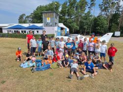 Die beiden zweiten Klassen der Grundschule Weihenzell haben sich unseren Flugplatz am gestrigen Dienstag als Ausflugsziel ausgesucht. 36 Kinder haben zusammen mit zwei Lehrerinnen und einem weiteren Betreuer anlässlich ihres Wandertages zum Ende des Schuljahrs den Vormittag am Flugplatz in Petersdorf verbracht. Nach der Wanderung von der Schule zum Platz wurde natürlich erst einmal ausgiebig gevespert, bevor das langjährige Vereinsmitglied Erich Franz die Kinder mit interessanten Informationen rund um den Flugbetrieb und die dahinter steckenden physikalischen Grundlagen versorgt hat. Anschließend wurden einzelne Flugzeuge wie die vereinseigene Cessna 172 oder das mit einem Elektromotor ausgerüstete Segelflugzeug vom Typ LS8 eingehend besichtigt. Vom Turm aus war dann der Blick über das gesamte Gelände des Flugplatzes möglich. Dabei konnten die Kinder auch die derzeit am Flugplatz trainierende Deutsche Segelkunstlflugnationalmannschaft bestaunen. Eine Vorführung durch den Segelkunstflugweltmeister Eugen Schaal in seiner eigenen selbstgebauten einmotorigen Kunstflugmaschine wurde mit donnerndem Applaus belohnt. Danach stand der Weltmeister den Kindern auch für Fragen zur Verfügung was von den Schülerinnen und Schülern ausgiebig genutzt wurde.